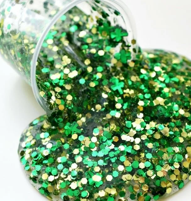 2. In one bowl add 1/4 cup of clear glue and a generous sprinkle of glitter and shamrock confetti.